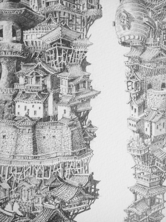Using pencils and watercolour, he describes the tiles and wood in fine detail, rendering the scenes in deformed 3D to emphasise and immerse. Some of his influences come from Japanese manga; like Katsuhiro Otomo’s Akira and Matsumoto Taiyo’s Tekkon Kinkreet. In Joetsu city, he can walk and plan his images, drawing inspiration from the roadside rocks and trees, moss and the long history of the area. In his words, he describes it as “shinpiteki”: mysterious in Japanese.