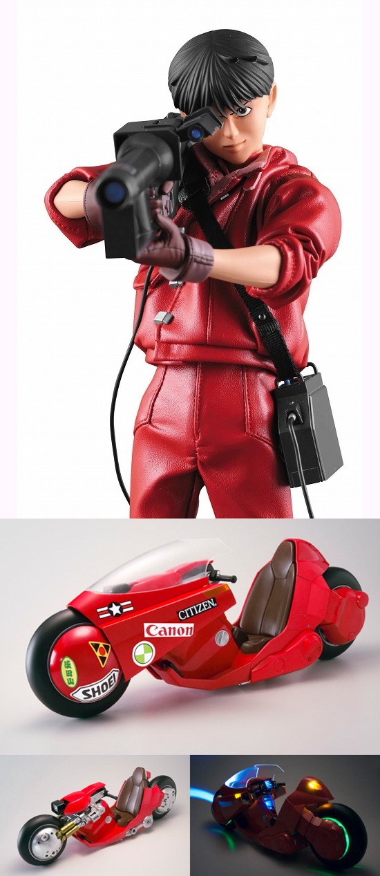 So, as a fan, geek, otaku, whatever, of Katsuhiro Otomo’s Akira; I have found it very hard to contain my excitement for the new Bandai/Medicom project. Set for release in a few months is a 1/6 scale version of Kaneda’s bike tricked out with twin coil, double rotar ceramic whatsimis and light up displays…and a 30cm articulated figure of the anime’s anti-hero Kaneda. Sadly, this set is strictly for the fanatical weighing in at around 600US for the set…(it’ll eat you up and spit out the seat sport).