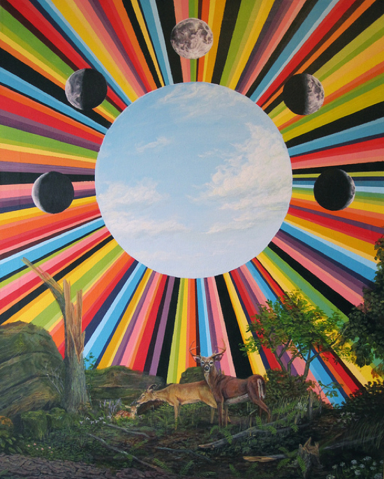 A strange wind swept me up and took me to the bar before I could update the news roll. So here is yesterday’s news today. Still fresh though. Check out Ryan Nault’s acrylic pieces on his photostream. The psychedelic colour, lunar themes and contrasting wilder-beast were all winners with me. Being a fan of all three it was hard to resist a wee post.